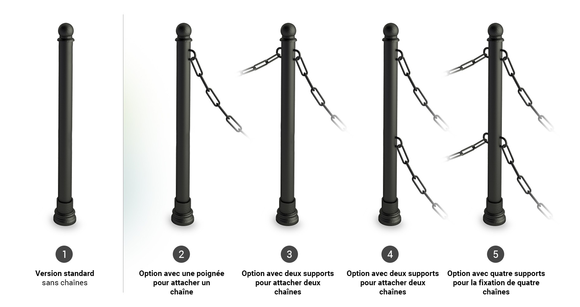 Existen dos tipos de bolardos de calle con cadena: la cadena clásica Koral y la cadena decorativa Solid. Dependiendo de sus necesidades, hay cinco opciones para configurar un bolardo con cadenas. Opción uno - pivote sin cadenas (versión por defecto), opción dos - pivote con una anilla para cadena, opción tres - pivote con dos anillas para cadena a ambos lados del pivote, opción cuatro - pivote con doble fijación de cadena a un lado, opción cinco - pivote con doble fijación de cadena a ambos lados del pivote. La siguiente ilustración muestra un ejemplo de pivote Bene.