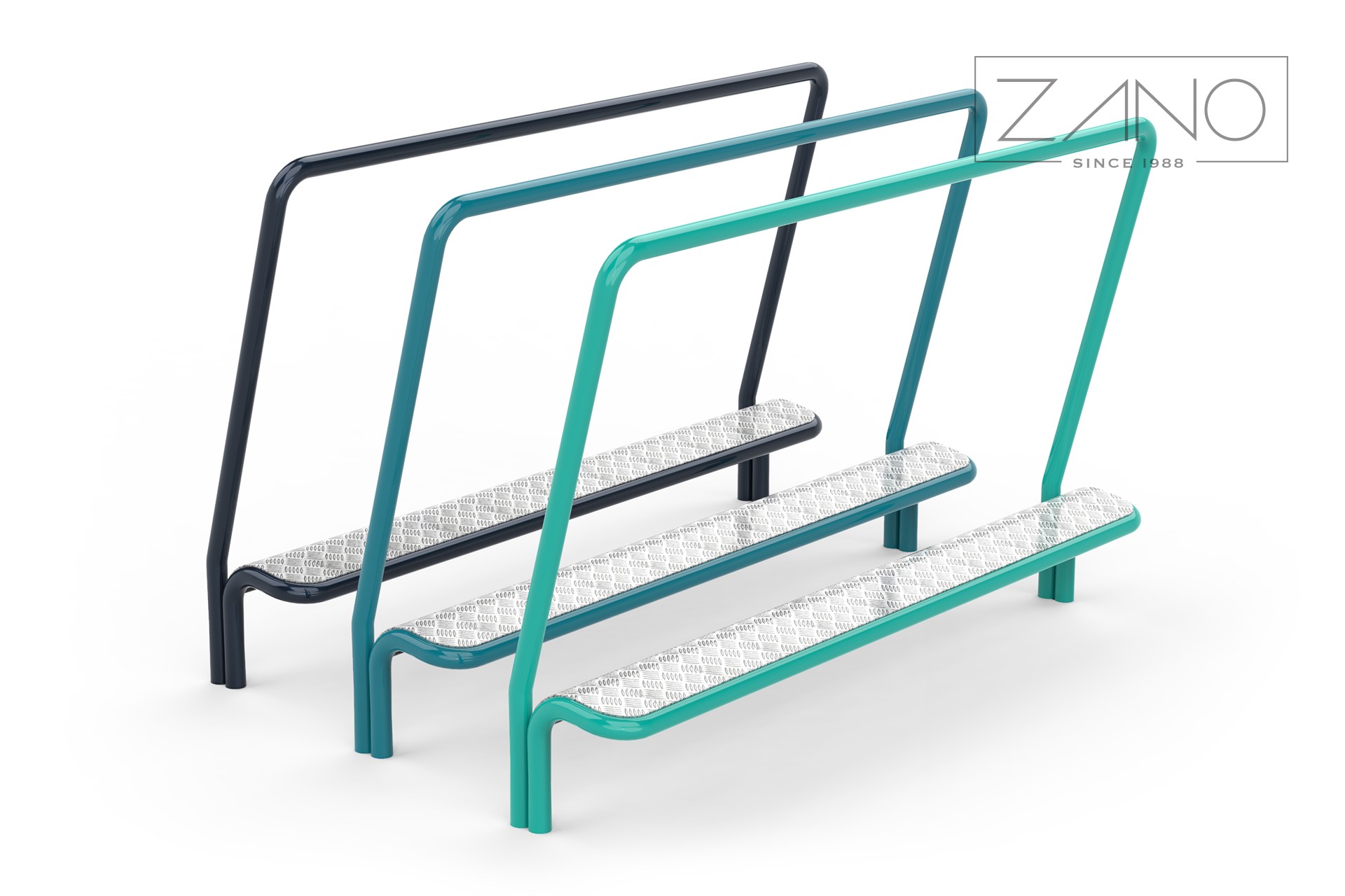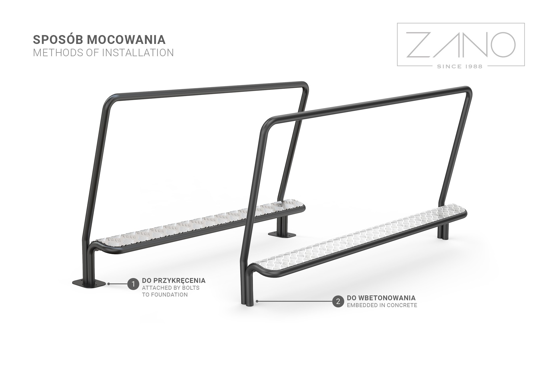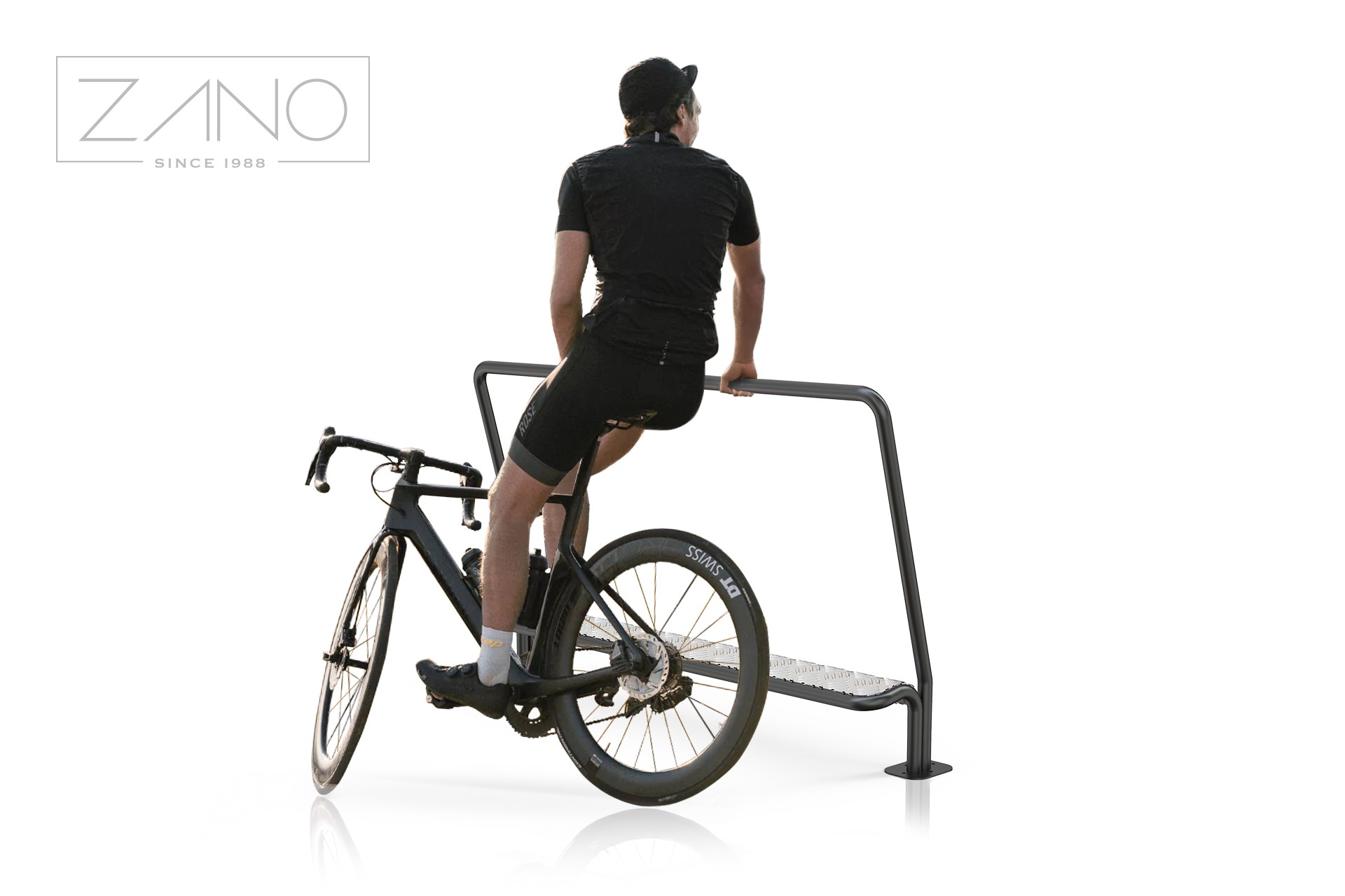El soporte para ciclistas está hecho de tubos y consta de dos partes. Puede sostener su mano sobre la superior y apoyar la pierna sobre la inferior. Su sencillo diseño permite que se integre en cualquier espacio urbano. El soporte está fabricado en acero inoxidable o galvanizado. Instalación con cimentación de hormigón o pernos de expansión.