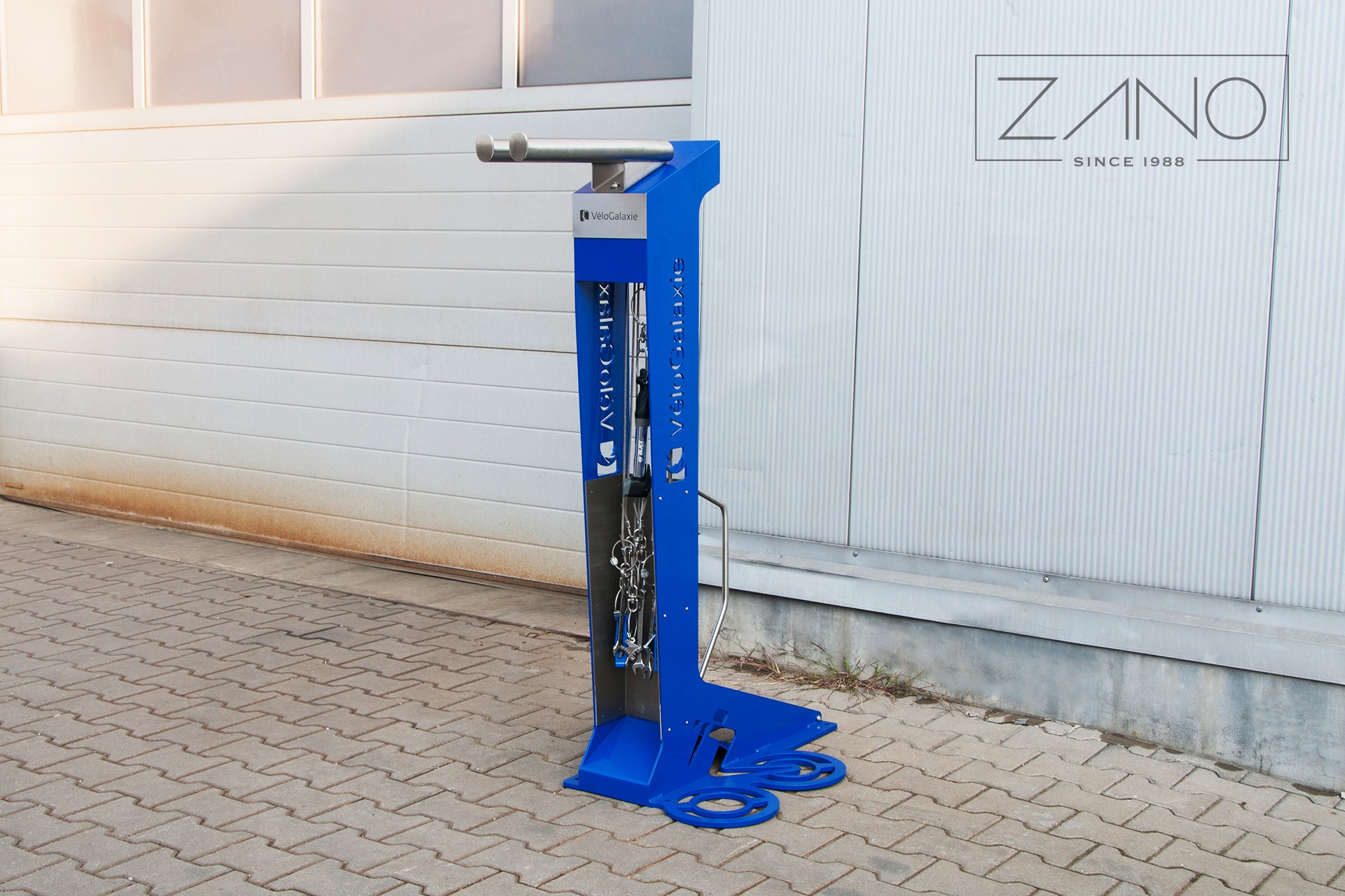 La estación para la reparación y el mantenimiento autónomos y urgentes de bicicletas está equipada con un portabicicletas, un soporte trasero para bicicletas, una bomba de suelo con manómetro y un kit de herramientas.