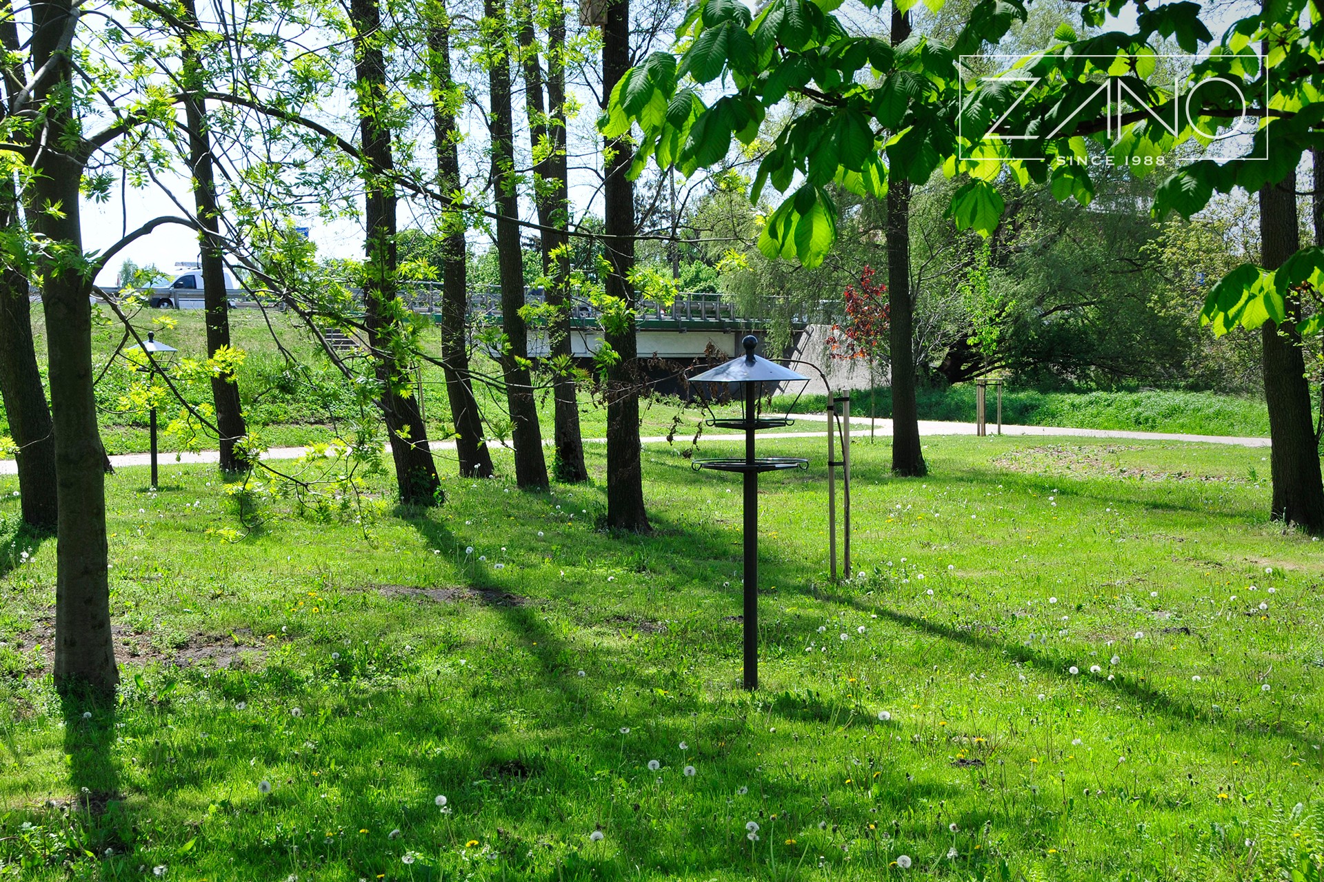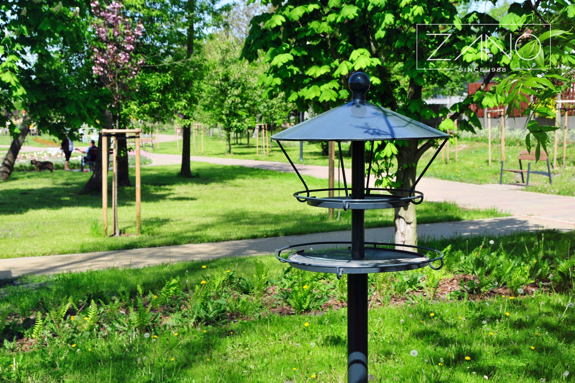 Una novedad absoluta en la oferta de la empresa ZANO. Un comedero para pájaros, de estilo retro, que combina varias características: lo práctico de un comedero para pájaros clásico y el énfasis en el diseño, que es el sello de ZANO. El interés en la apariencia es importante debido a que el comedero también puede ser un adorno, como cualquier otro elemento del mobiliario urbano. Fabricado con tubos de acero, pintado en cualquier color de la paleta RAL y hierro fundido para los elementos decorativos. La estructura se monta en un poste de 2,4 metros de altura y se fija con una base de hormigón.