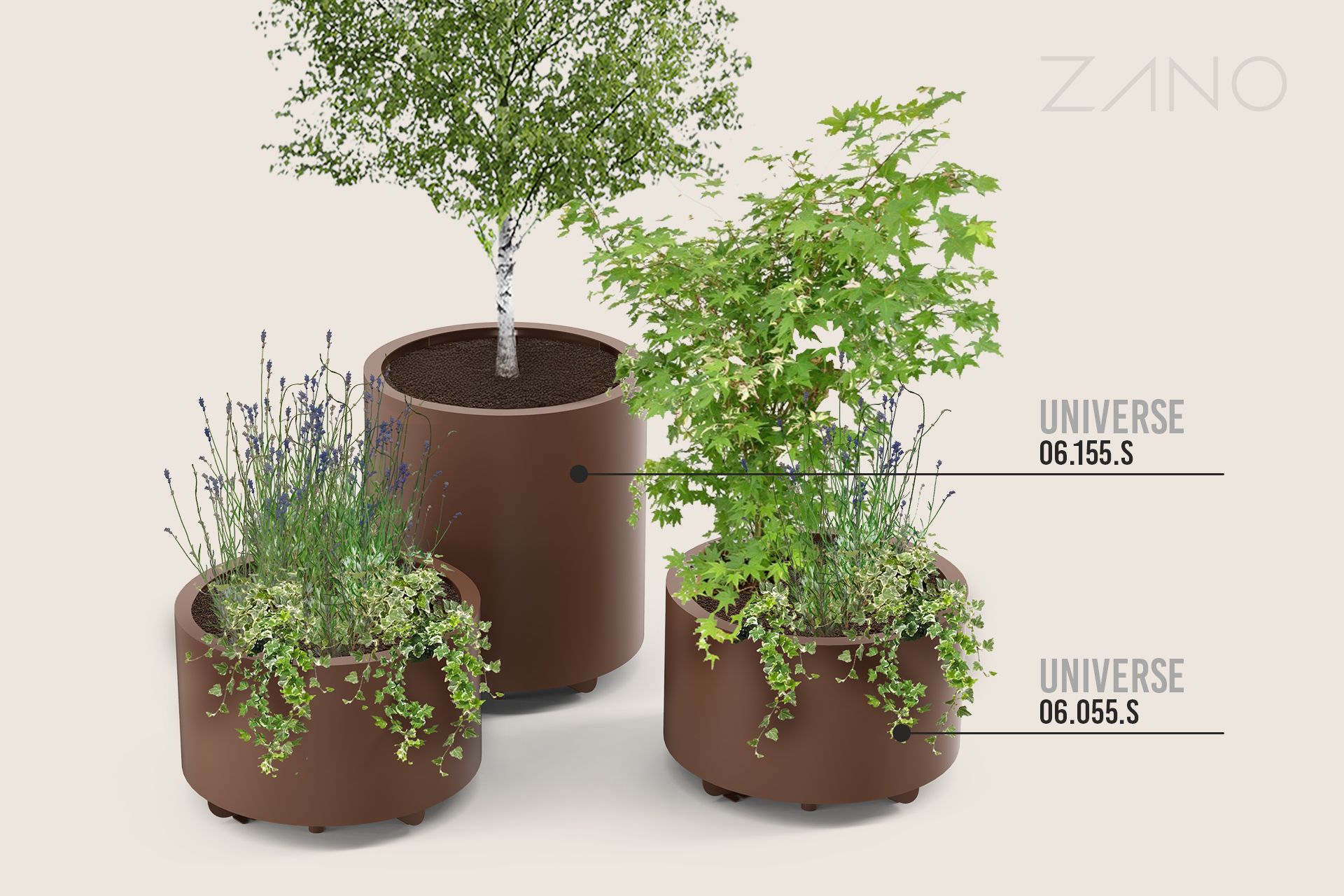 El macetero Universe 06.155.S es una variante más alta del macetero de tamaño S, que forma parte de la serie Universe de mobiliario urbano que incluye maceteros y bancos. Puede combinarse con el banco Universe 02.455.3 para crear una composición espacial coherente. La estructura está fabricada con chapas de acero al carbono S235JR de 2 y 3 mm de grosor, protegidas mediante galvanización y recubrimiento en polvo según la paleta RAL, u opcionalmente en acero inoxidable 1.4301 en versión pulida. El fondo de la maceta tiene cuatro orificios de drenaje para garantizar la correcta evacuación del exceso de agua.