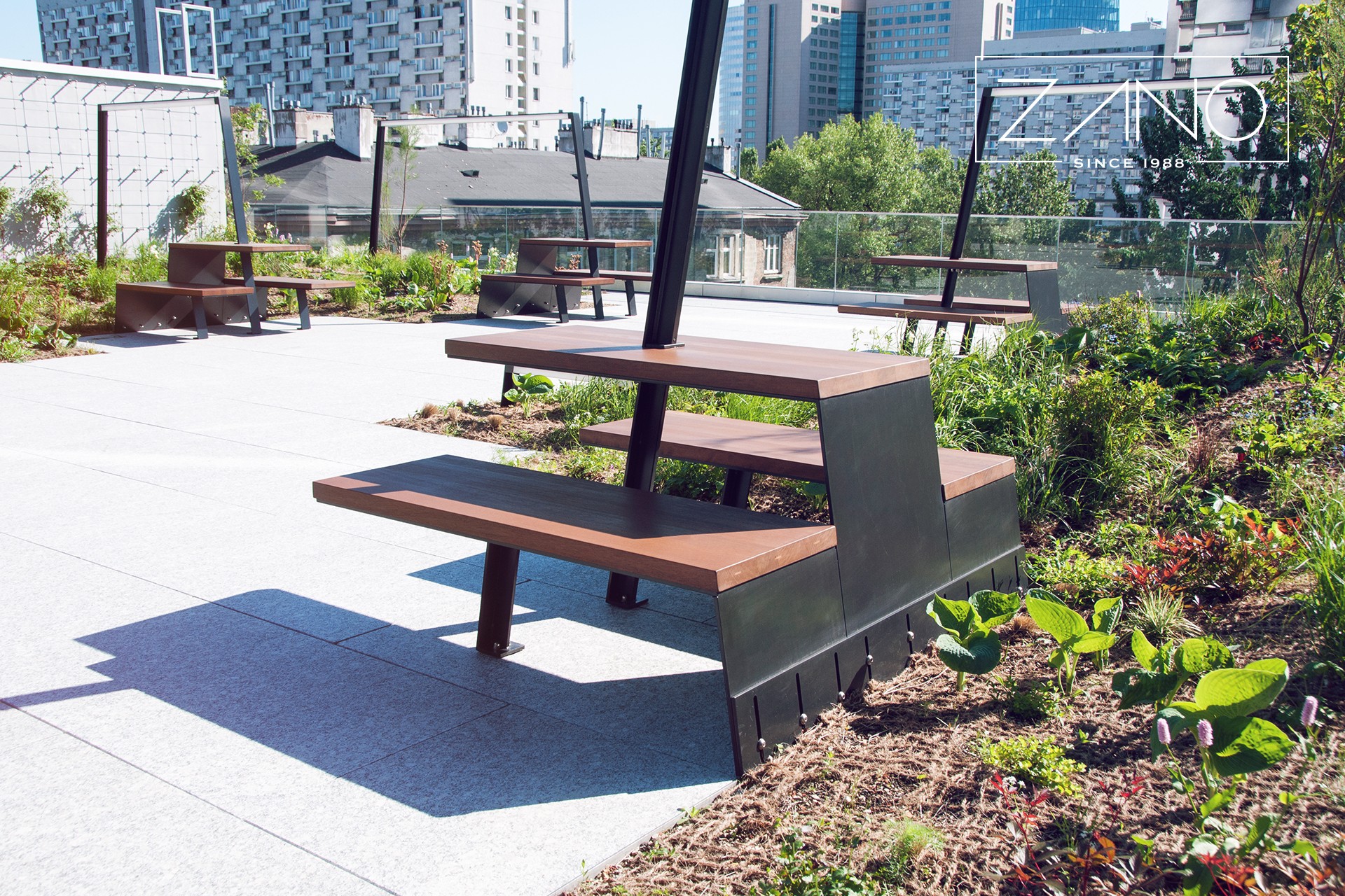 Una vez más tuvimos el honor de trabajar con el excelente estudio Malinowski Design Urban & Landscape. El proyecto del estudio consistió en la creación de mobiliario urbano para la terraza de la Mennica Legacy Tower en Varsovia. ZANO, como fabricante de mobiliario urbano, se encargó de fabricar el mobiliario según el diseño aportado. El mobiliario está fabricado en acero al carbono s235Jr, galvanizado y con recubrimiento de pintura en polvo en color RAL 9004. La madera utilizada en el proyecto es madera dura de Iroko protegida con aceite.